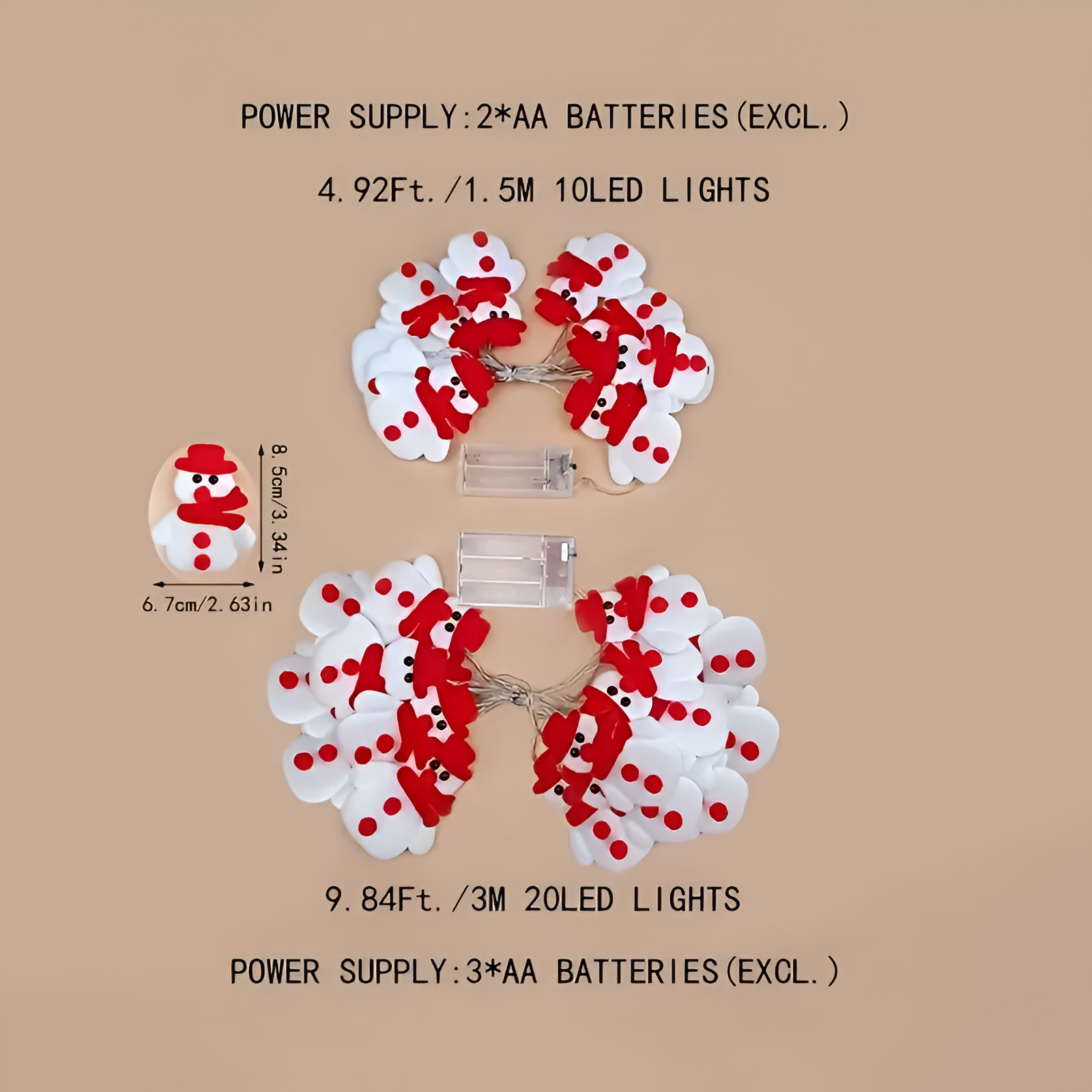 Crafted with attention to detail, the snowman figures feature red hats and scarves that complement the gentle illumination of each bulb. The design is simple yet gaze-catching, ideal for enhancing the ambience during winter celebrations. Powered by batteries, this lighting set offers easy placement anywhere without the need for outlets or complex setups.
