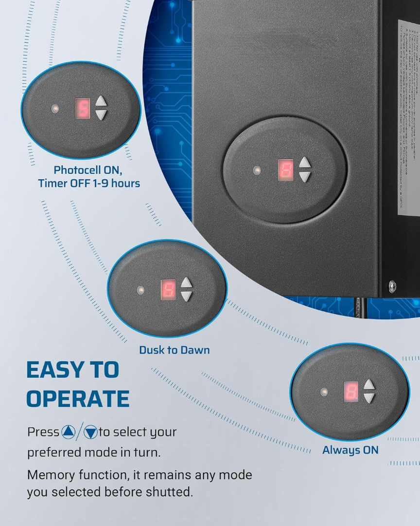 This model includes built-in mounting holes and a 3.3-foot grounded power cord for fast setup. Simply mount it on an outdoor wall or any flat surface near your lighting system. Clear mode selections—Auto, Always On, or Countdown—make it simple for any user to operate.