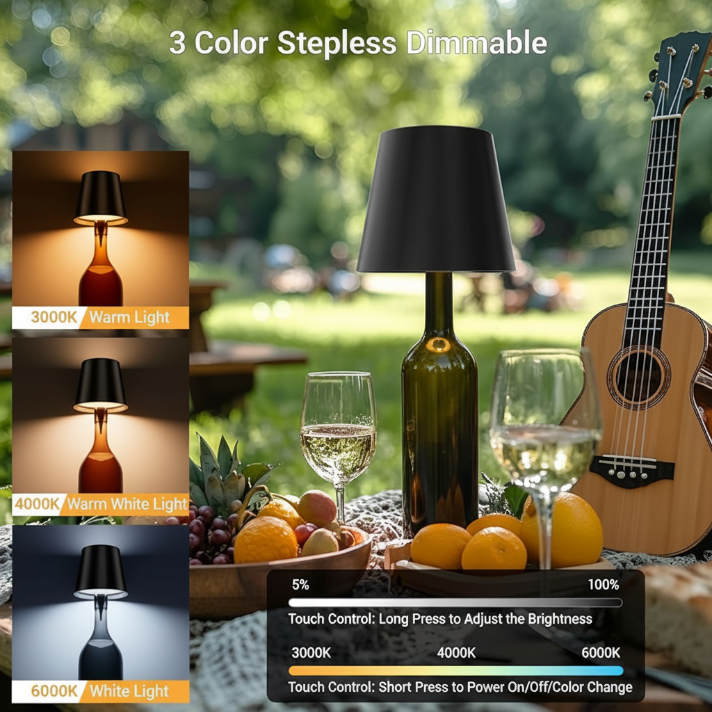 The Rechargeable Wireless Bottle Light Table Lamp is a cordless bottle-top tabletop lamp designed for use with many bottle styles (bottle not included). It includes three color temperature settings, stepless dimming, and a rechargeable 5200mAh battery charged through USB Type-C. Its compact metal construction supports placement on dining tables, bar counters, shelves, bedside tables, and event display setups.
